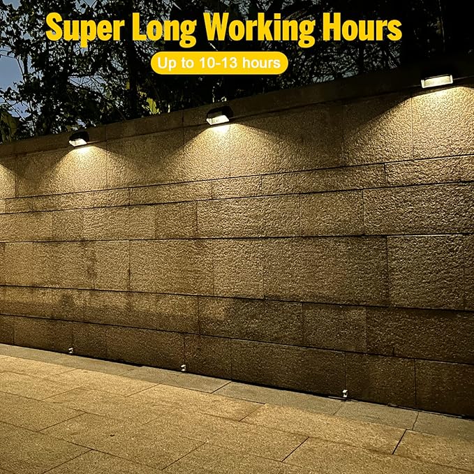 • 【High Brightness & Long Working Time】This is a super bright solar fence light, equipped with 4 high-quality LED lamp beads, and the brightness reaches 30LM, which is much brighter than that of ordinary fence lights on the market. Its battery capacity is 1200mAh, and working time is more than 10h. Solar deck lights can provide you with a bright and romantic lighting environment, creating a relaxed and comfortable atmosphere.