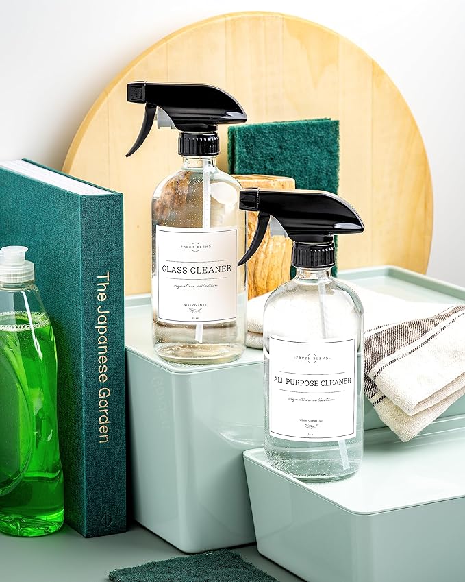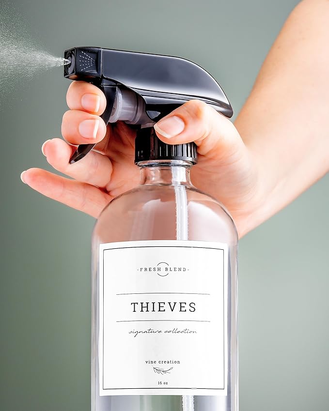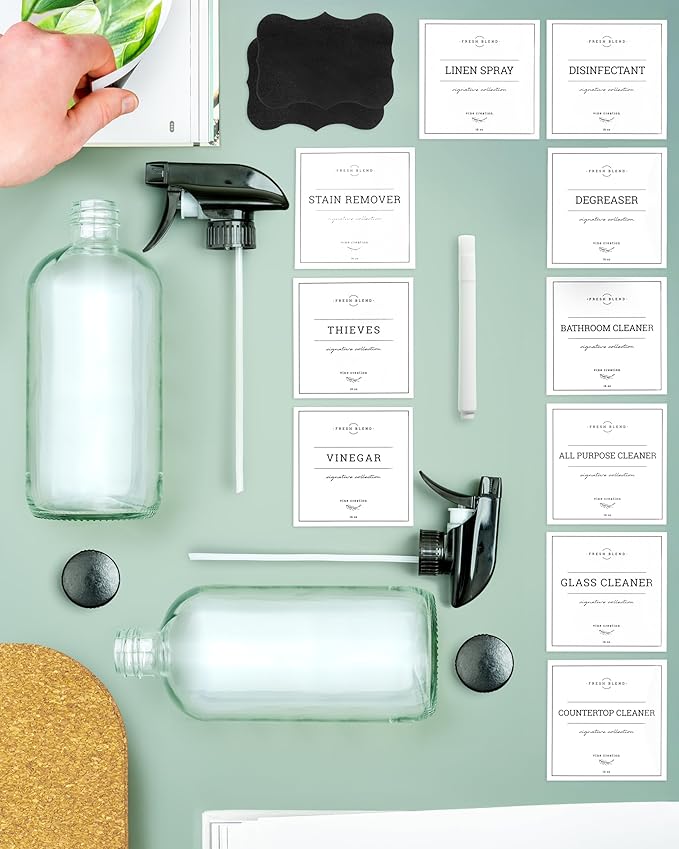 • PREMIUM WATERPROOF LABELS - Ten elegant high-end labels included, glass cleaner, countertop cleaner, vinegar, all purpose cleaner, thieves, bathroom cleaner, degreaser, disinfectant, linen spray, and stain remover. Durable and waterproof for daily use. Additionally two chalk labels for any other needs, white marker is included. Premium Labels measurement 3" x 3".