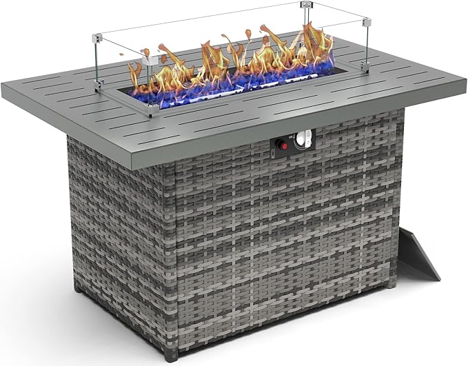 44 Inch Propane Gas Fire Pits Table for Outside Patio, 60000 BTU Rectangular Outdoor Wicker Rattan Fire Pit with Glass Wind Guard