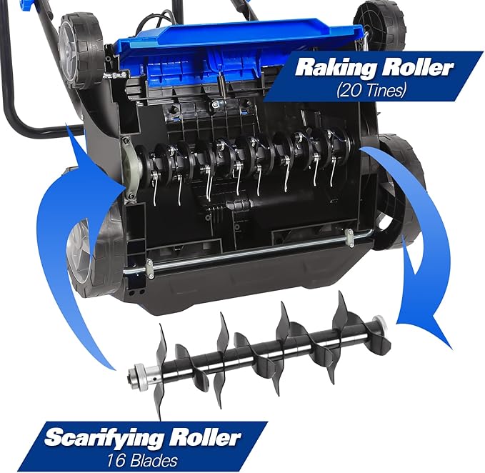 • Scarifying and Raking Mastery - A Lawn's Best Friends: Experience the art of scarifying and raking with finesse. Our dethatcher boasts a scarifying roller adorned with 16 precision blades, aerating your lawn to perfection. Complementing this prowess, the lawn rake cylinder showcases 20 robust spring steel tines, meticulously picking up maximum thatch for an immaculate result.