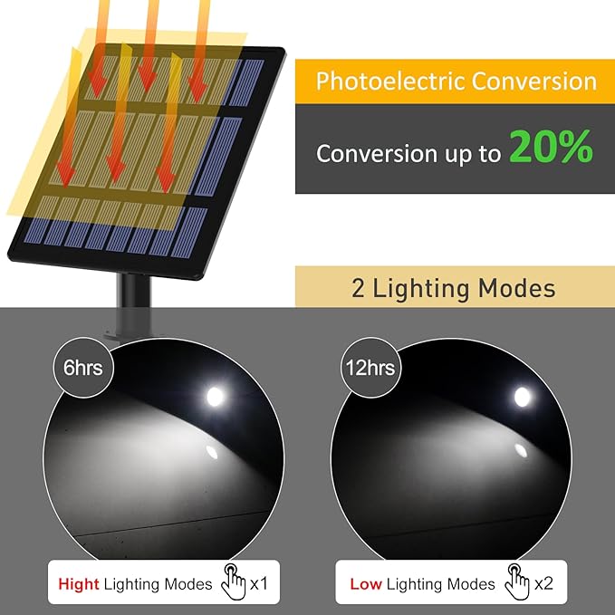 • 【4-in-1 Solar Spotlights】 Upgraded solar panel, holding the efficiency up to 20% conversion of solar energy. Providing more than 8-9 hours working after 6-8 hours fully charged.