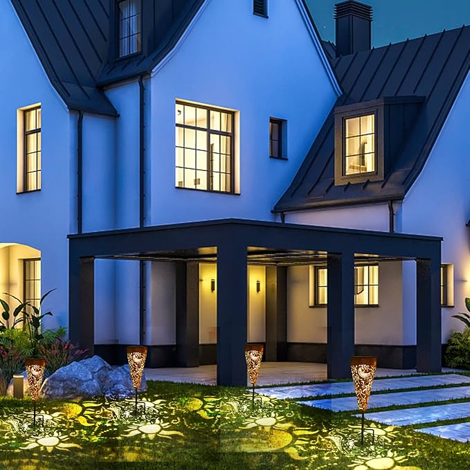 • 【Gorgeous & imaginative Garden Decor 】 Fusion the retro gold, copper of exteriors and irregular pattern inside, at darkness, the solar top casting a bright, warm light with Sun and Moon pattern, Excellent choice for pathway decoration