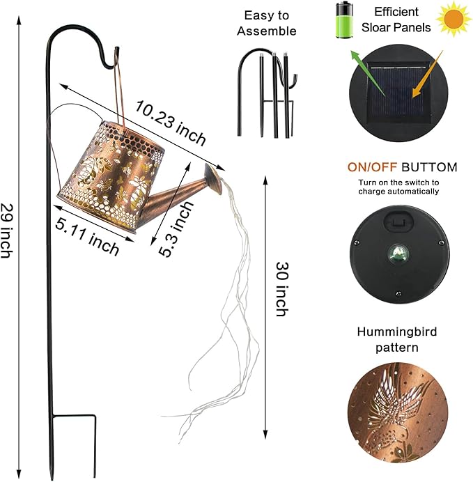 • 【Solar Watering Can With Lights】This solar outdoor lights is a unique and attractive outdoor decoration for gardens,vividly imitating the effect of flowing water.There are 6 copper string lights with a length of 25.9 inches (75 centimeters) and 42 ultra bright LEDs.The 32 inch shepherd hook attached to the solar waterfall lights is a perfect addition to garden decoration for your vines,potted plants,porch,path, terrace,and more.