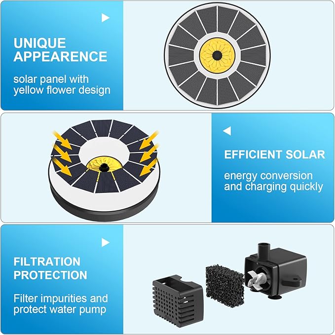 • Elegant Design:This solar powered fountain pump is both functional and stylish;Its yellow centerpiece design resembles a blooming flower,adding a touch of beauty to any garden or outdoor space