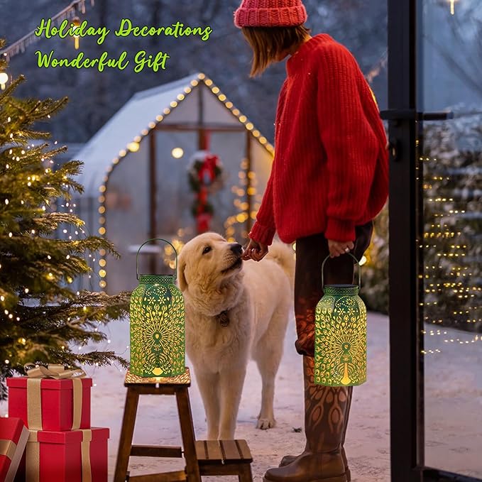 • {Unique Peacocking Design} The 2Pack big outdoor lanterns come with peacock hollow design with attractive and lovely natural green color, 800mAh Battery, emit 13 high lumens bright warm white glow and cast amazing pattern.Green peacock symbolize good luck, hopeand health, which is really nice gifts for your mom dad grandma grandpa sisters wife and friends.