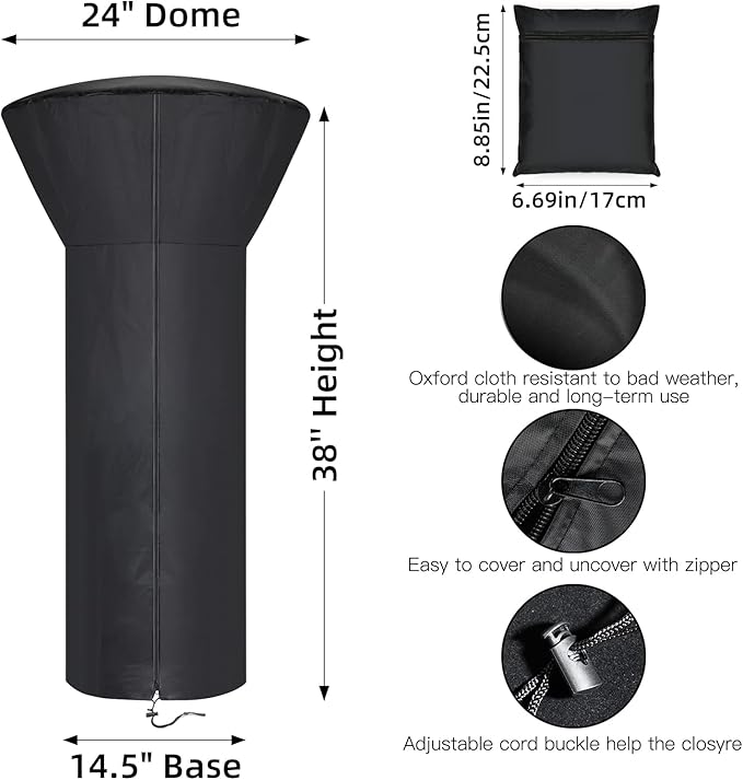 • Size:38"Height* 24"DIA(Dome) *14.5DIA(Base) fits most pro-pane patio heater for outdoor.But before placing your order,please confirm your patio heaters' size.