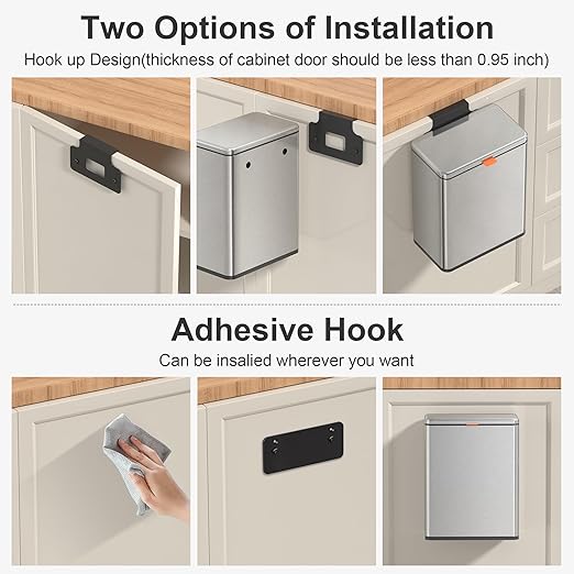 • 【WALL MOUNTED/COUNTERTOP/ UNDER SINK TRASH CAN】: No need to bend over. The trash can provide Two opening and installation methods,Effortless and Fits for Most Cabinet Doors, Pantry Doors. The thickness of door should be less than 0.98" (2.5cm). Small trash can can also be glued on kitchen or bathroom wall or under the sink.