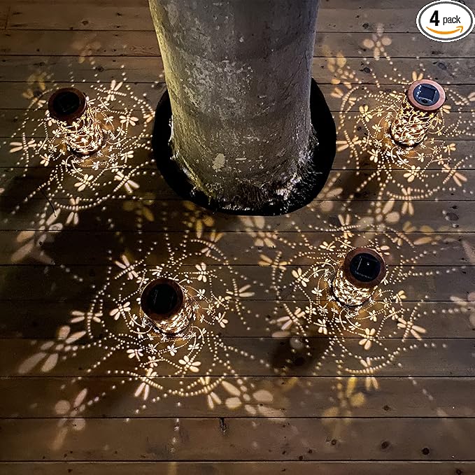 • Gorgeous & imaginative Garden Decor - Fusion the retro gold, copper of exteriors and irregular pattern inside, at darkness, the solar lantern casting a bright, warm light with dragonfly pattern, which looks like a dragonfly flying symbolizes change.