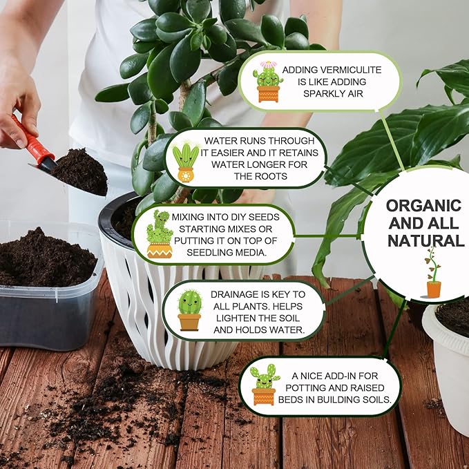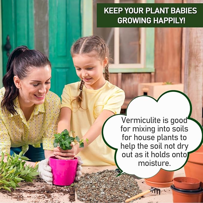 • Say Goodbye to Slow Plant Growth: You can try using vermiculite to make a soilless mixture. Garden vermiculite is good for mixing into soils for house plants to help the soil not dry out as it holds onto moisture. Another way to use this is mixing into DIY plants starting mixes or putting it on top of seedling media. It is very lightweight so the seedlings won't have a problem poking through it. It lightens the soil for better root growth. Helps growth in new beginning plants