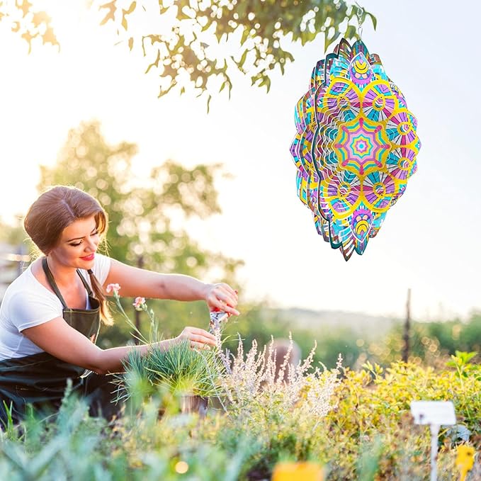 • ★【Durable Yard Garden Decor】Our hanging garden spinner are made of durable stainless steel by laser-cutting technology to form vivid shape, it delivers a wave of mesmerizing patterns that will surely delight any spectator. Individually hand painted epoxy protective coating with colored glitter inside,has better outdoor weather resistance,not easy to rust.Beautiful patterns that sparkle & won’t fade in the sun.