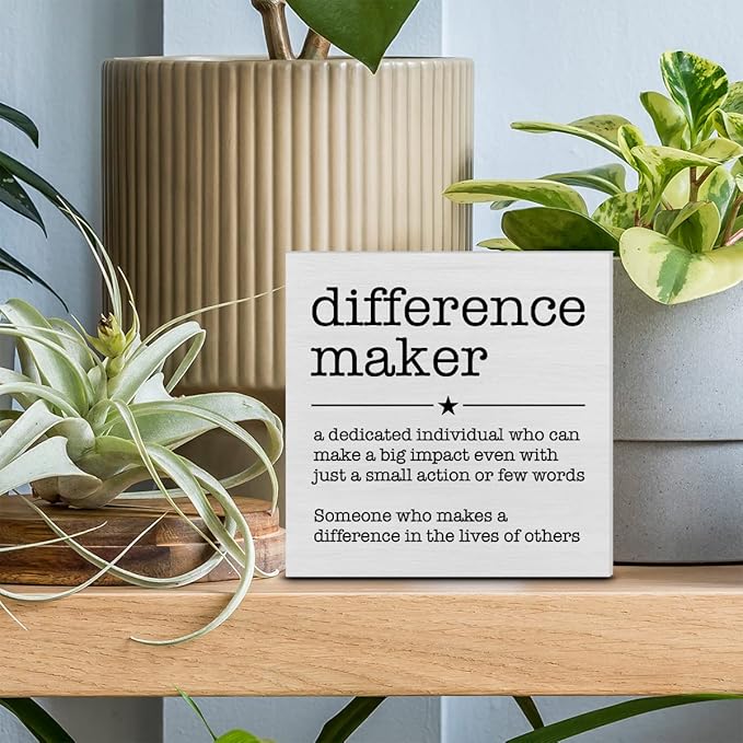 PIXCEOS Difference Maker Definition Decorative Wooden Box Sign Thank You Appreciation Gift for Teacher Boss Leader Coworker Wood Block Plaque Desk Decor Office Shelf or Wall Display