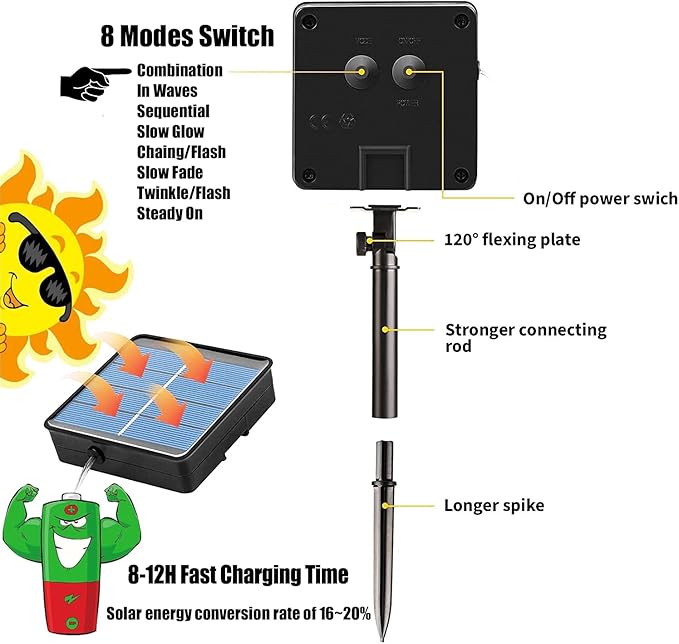 • 💡【Up to 19% High Energy Conversion Rate】Our solar rope lights are equipped with 100 low-heat LED chips, achieving a high energy conversion rate of up to 19%, compared to the industry standard of 13%. These lights are not only environmentally friendly, harnessing endless energy from the sun, but also durable and safe to use. The LEDs will not overheat even after hours of usage.