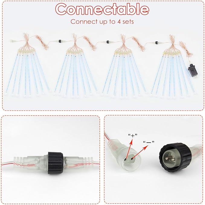• Red and White Meteor Shower Rain Lights: Each package contains 2 sets of connectable lights. Each set light has 8 tubes with 192 LEDs. Total 16 tubes with 394LEDs. The LEDs are double-sided inside the tubes which make it illuminates from any angle