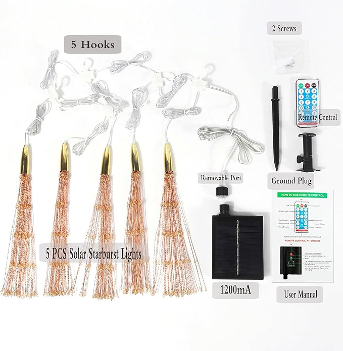 • 【Upgrade 200 BULBS +MORE BRIGHTNESS】5pcs solar firework lights are connected to each other, LED starburst lights have 5 LED bulbs on each copper wire, you can get the string light of 1000 LED bulbs. Copper wire can be bent into your favorite shape. The hanging lights has flashing modes (normally lit/flashing). Better decorate your environment.