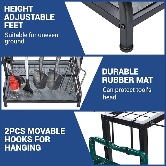 • NEW DESIGN GARAGE ORGANIZATION: 10 G-hooks allows for electric tools like string trimmer and some tools with D-grip handle. In addition, there are 39 square holes, 2 movable hooks, and 4 fixed hooks. It can accommodate a wide range of tools for you. Height-adjustable feet suitable for uneven ground, durable rubber mat can protect your power garden tool 's head