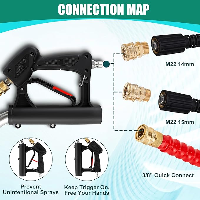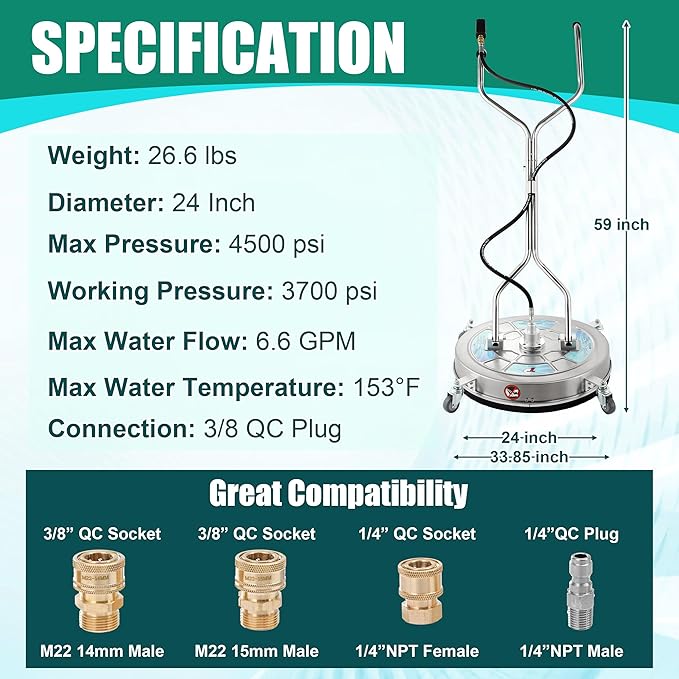 • EASY ATTACHMENT & COMPATIBILITY: The package includes 3/8" QC to M22-14 male fitting and 3/8" QC to M22-15 male fitting, making it compatible with most pressure washers on the market. Upgrade your pressure washer with this high-quality 24" stainless steel pressure washer surface cleaner.