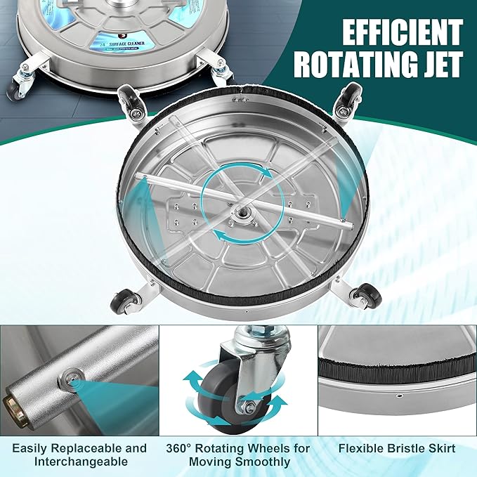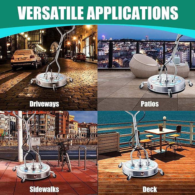• STAINLESS STEEL CONSTRUCTION: The surface cleaner for pressure washer is made with corrosion-resistant stainless steel, which ensures durability and longevity. Whether you're cleaning your driveway at home or a large commercial space, this surface cleaner will stand up to the task.