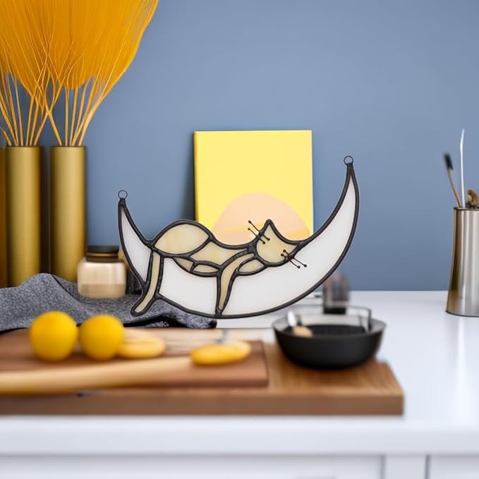 • STAINED GLASS MOON CAT MATERIAL:The Blue Moon Black Cat is made up of hand-cut colored glass plates, and every color is hand-painted and then welded together with copper foil. Because of its unique craftsmanship, every product is unique (Note:The product glass may have small bubbles due to the process)