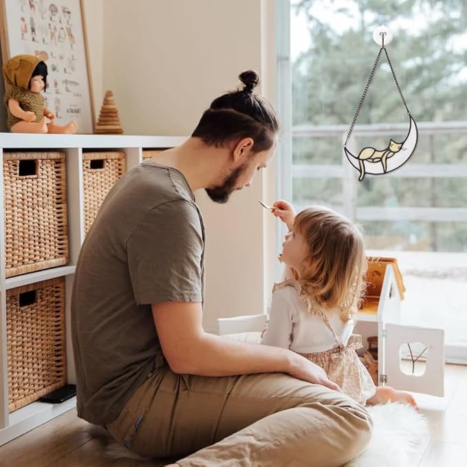 Yellow Cat Decor On Blue Moon Stained Glass for Window, Crystals Suncatchers for Window Ball Prism Rainbow Maker Chain Easy Hanging 2 Balls and 1White Gift Boxes for Cat Lovers Halloween Decor