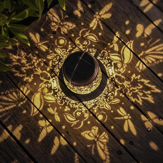 • Graceful Decorative Design - The retro appearance, with gold copper color and hollow out metal veneer, the solar outdoor lanterns casts bright and warm light in darkness, accompanied by gorgeous and graceful bunny dragonfly butterfly patterns, adding a beautiful atmosphere to the surrounding environment.