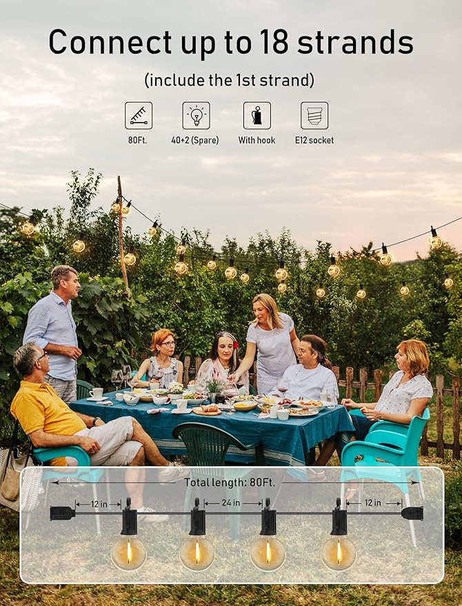• 【 80ft LED String Lights 】- This outdoor light comes with 40 clear G40 LED bulbs. Each bulb is 2 feet apart for a total length of 80 feet. It supports an end-to-end connection of up to 17 strings, allowing you to customize the length you need. With the size of 1*1*2 ft, these lightweight and convenient patio lights are easy to carry and store