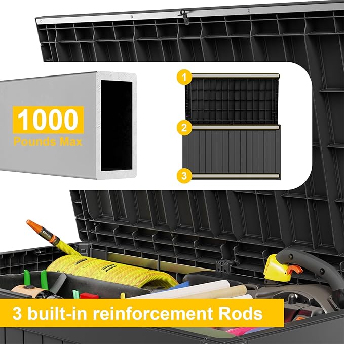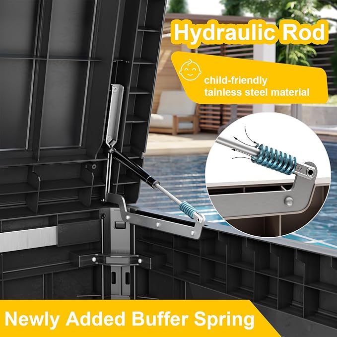 • EASY TO USE: The deck storage box is designed for convenience with built-in handles on both sides, allowing easy lifting and movement. Plus, for added security, you can install a password lock/small lock (not included) on the top cover