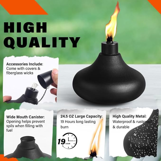 • ✿High Quality Metal Table Top Torches: Our Metal Table Top Torches made of premium metal. durable and lightweight. Each tabletop torches hold approximately 24.5 oz of fuel, allowing the burning time more than 19 hours .