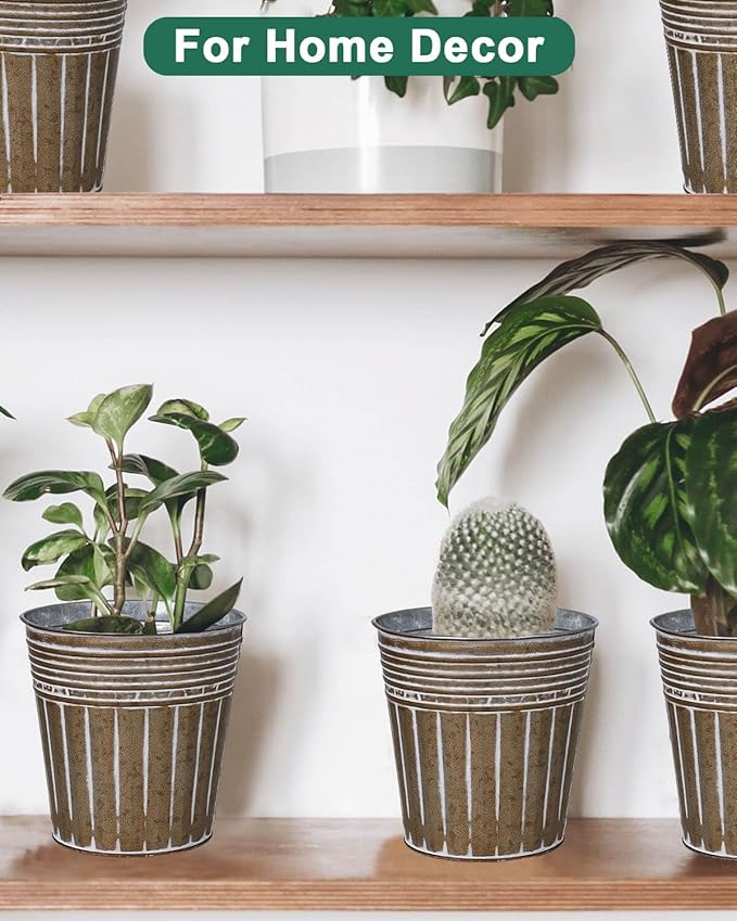 vensovo 6 Inch Brown Metal Rustic Flower Pots - 6Pcs Galvanized Planters with Drainage Hole and Rubber Plug, Rustproof Small Metal Bucket Plant Pots Farmhouse Vintage Style for Decor