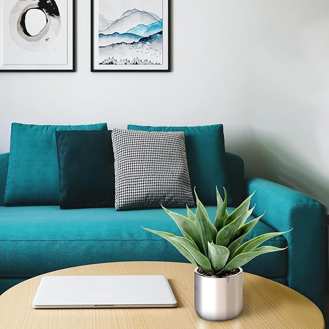 • [High-quality Artificial Agave Plant] -13 faux aloe vera leaves are elegantly arranged in a sturdy, shiny silver-plated pot and surrounded by natural stone pebbles. The overall height of faux potted plant is about 13". Luxurious pot: 4.3" W x 4 .7" H.