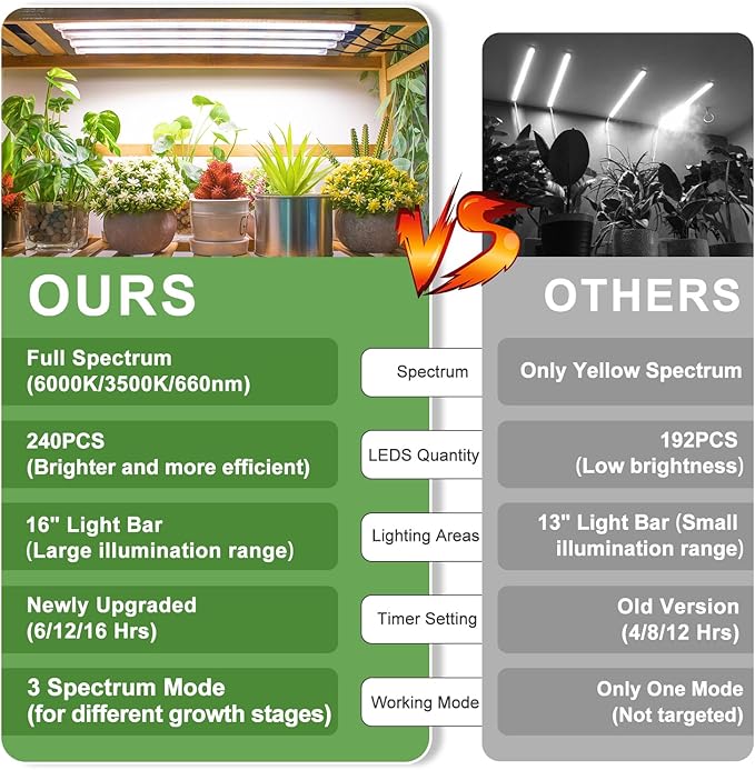 • Upgraded Timer: Our plant light timer has been upgraded to 6H, 12H, 16H to ensure the plants have enough time to do photosynthesis to grow faster and better; It will auto turn on or off every day, with no need for more manual operation