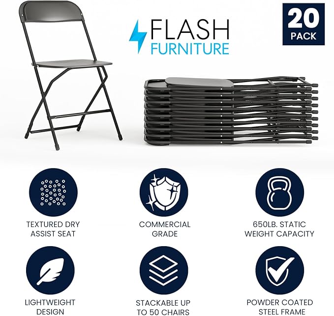 • Set of 20 lightweight plastic folding chairs provide commercial-grade, on-demand seating solutions; foldable stack chairs are a smart investment for business and home usage