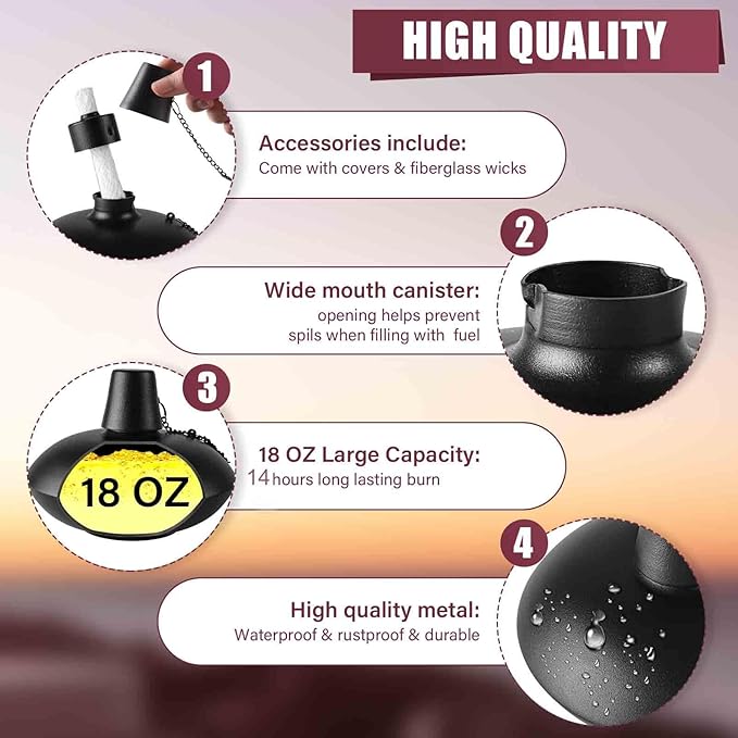 • ✿High Quality Metal Table Top Torches: Our Metal Table Top Torches made of premium metal. durable and lightweight. Each tabletop torches hold approximately 18 oz of fuel, allowing the burning time more than 6 hours .