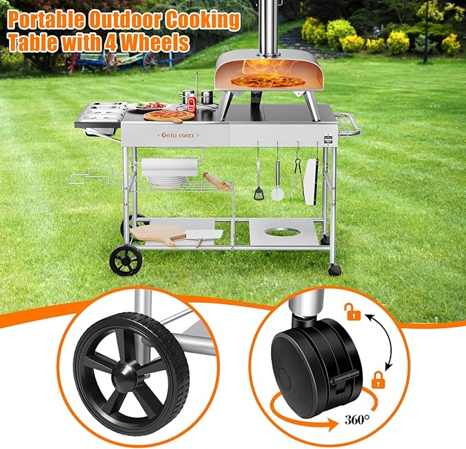 • 【Effortless Mobility with Lockable Wheels】Equipped with four wheels, this grill table offers smooth mobility. The side handle allows for easy maneuvering, and two of the wheels rotate 360° with a locking mechanism to keep the table securely in place while you cook. Perfect for backyard barbecues, patio dinners, or tailgating at the park.