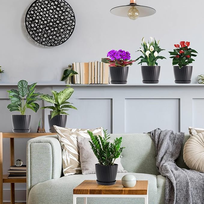 • DECORATION YOUR HOME GARDEN - 6 pack 7 inch planters with grey color, transplant plants to these pots, fill up with mix soil, water and let drain, then place a saucer under each plant. Brings a new stylish home garden. Pefect for hanging up or placed on windowsill, shelf, bedroom, kitchen, office, desktop, garden, etc.