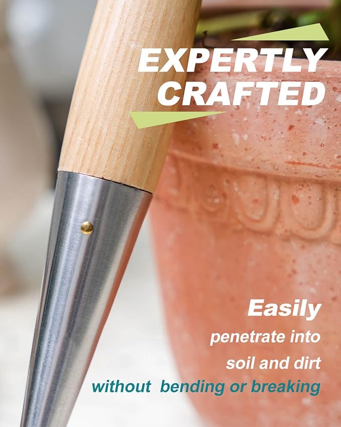 • COMFORTABLE HANDLE - The ergonomically designed hardwood T-handle provides a comfortable grip, reducing hand stress and tension. It also has a leather loop for easy storing and hanging. For those with good taste, this is a beautiful and elegant garden tool.
