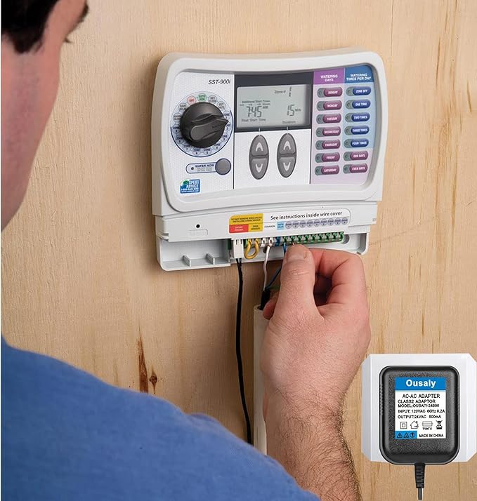 • POWER :Input volatage is 120VAC 60Hz; Output rating is 24VAC 500mA. Compatible with Rain Bird UT1 SST Series Orbit timer,sprinkler timer,sprinkler system,irrigation system, irrigation setup.Used this for sprinkler system power supply,sprinkler power supply ,sprnkler system box power adapte.