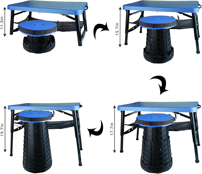 • 2-In-1 Camping Table And Stool: This folding camping tables and telescopic stool chairs can help you go out anytime and anywhere. The collapsible stool can be completely put into the foldable tables, and it is equipped with a handle outside the folding camp side tables. The material is high-quality plastic, it opens very smoothly and will not get stuck like aluminum products, even kids and women can easily open and close.