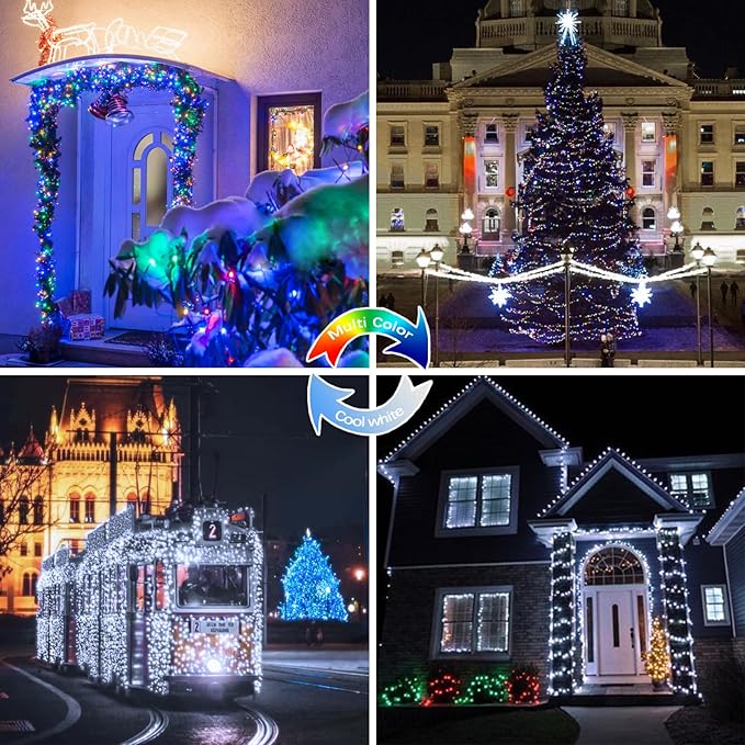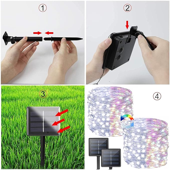 • Upgraded 2 Pack Super Bright Solar Christmas Lights: Cute shaped, powerful 1800mAh Capacity Battery, Super Bright Total 200 LED 80FT, Upgraded Larger LED Beads, IP65 Waterproof Performance. Durable Flexible Copper Wire, Quick Charging Technology, Cool White ⇋ Multicolor Switchable, Romantic Christmas Decorations. Solar string lights outdoor waterproof will be a great choice.