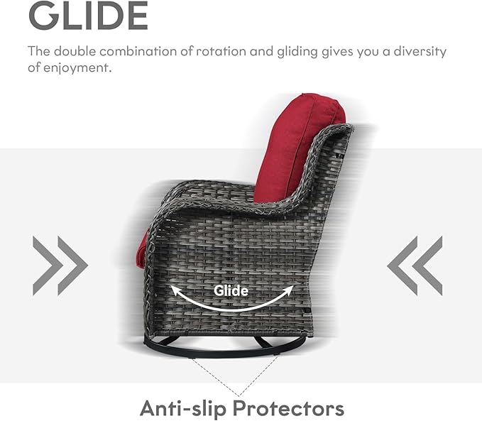 • 3.Multifunctional Patio Wicker Chair: The base of the swivel rocking chair is a dual-function disc base that can rotate 360 degrees and also glide back and forth, the operation will be very smooth. The swivel rocking chair is designed to help you sit more easily and comfortably, the base with a non-slip pad, so that the swivel rocker chair is more stable contact with the ground, do not worry at all that the chair will slide at will.