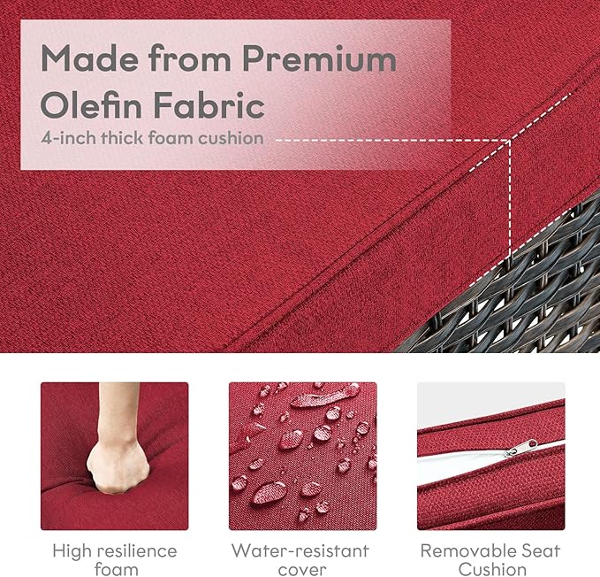 • 4.Comfortable And Easy To Clean: Both chairs in this outdoor patio set are equipped with 4-inch thick foam seat cushion and 8-inch thick cotton back cushion, which is ergonomic and improves the overall comfort of the wicker chair. The patio chair cushion covers are made of outdoor specialty olefin fabric that is water resistant, and each cushion is equipped with zippers that are removable and easy to clean.