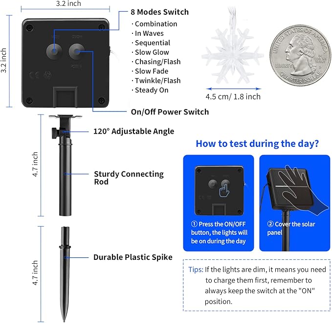 • 【Auto On/Off Management】Featuring a built-in photosensitive component in the solar panel, our Christmas Snowflake lights automatically turn on at dusk and turn off at dawn. No manual operation is required, making it extremely convenient for lighting decor. If you have any questions about our products, please feel free to contact us.