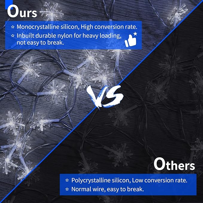 • 【Efficient Solar Snowflake String Lights】Our solar Christmas lights feature a 180-degree adjustable monocrystalline panel with a built-in 800mAh rechargeable battery, providing up to 8-10 hours of automatic operation every night without any additional electric cost;