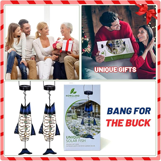 • 【Unique Solar Fish Design】- 2 Package offers excellent value for money. This garden art decor features handcrafted ironwork, including processes such as pattern making, rolling, lifting, blanking, forging, riveting, assembling, polishing, cladding, spraying, painting, stringing, packaging, and final delivery to the customer. The exceptional craftsmanship imbues the metal fish with unique character and adds beautiful string lights for added charm