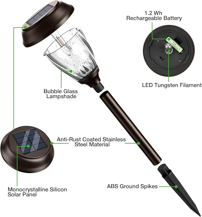 • Luxury Solar Lights with Crystal-Clear Durability - Featuring bubble-textured glass (93% light transmittance) and nano-coating for 96% easier cleaning, combined with 99.6% UV stability (5+ years) to resist yellowing. Superior Long-Term Light Transmittance Glass retains 80%+ clarity for 2 years (vs plastic’s 5%), while scratch-resistant design elevates modern decor and FDA-compliant storage solutions. Energy-efficient 100% light diffusion reduces waste, perfect for sustainable home landscapes.