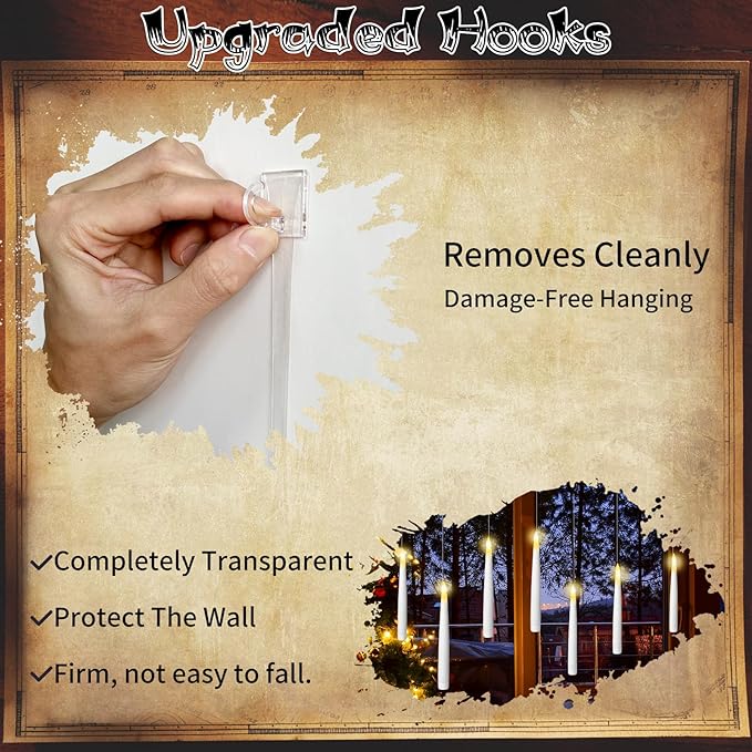 • 【FLOATING CANDLES】It's a fun way for children to hanging candles into the ceiling or fix these electric candles on the window, wall decoration with hook , perfect room decor for Halloween decorations, church services, window candles, the fireplace, table, home & outdoor decoration.