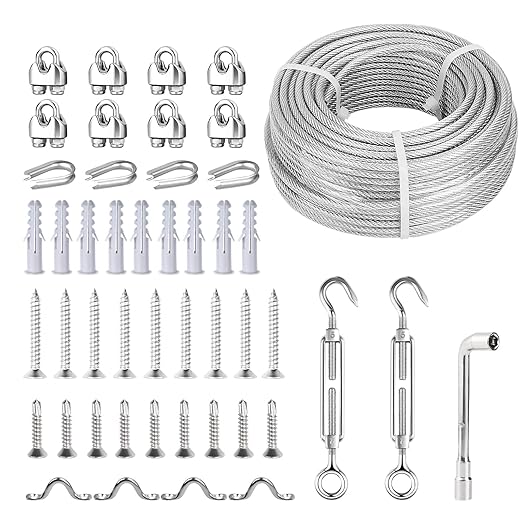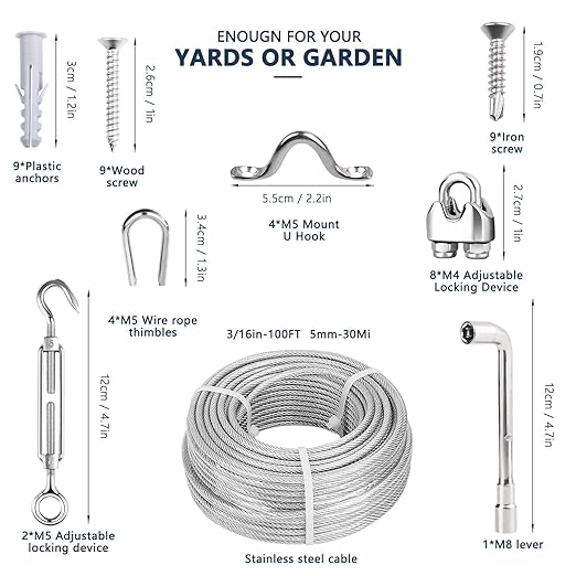 • Complete 3/16" Wire Rope Kit: 100ft 3/16 vinyl coated wire rope, 2 M5 turnbuckles for cables wire, 8 M4 wire rope clamps, 4 M5 thimbles, 4 M5 Mount U Hook, 9 Iron Screws, 9 Wood Screws, 9 Plastic Anchors, 1 M8 Wrench. Perfect for DIYers needing reliable solutions for anchored shed, fencing, sunshade