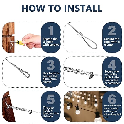 • Multipurpose Teniosner Wire Kit: The 3/16 cable tensioner kit is ideal for a variety of heavy-duty suspension applications, including string light hanging kit, garden wire system, wire curtain hanging system, chain link fence tensioning, cable railing kit, clotheslines, anti sag gate kit, fence wire, or building DIY railings, shade sails, and more (plastic anchors are suitable for concrete/brick walls)