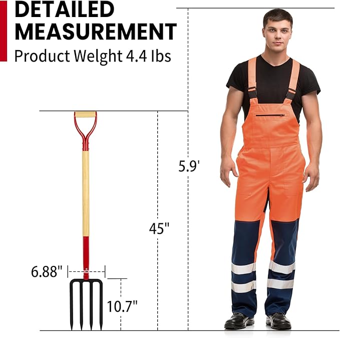 • Dimension: The heavy duty garden fork has an overall length of 45 inches and weighs 4.4 pounds, the ideal length and weight for adult use.