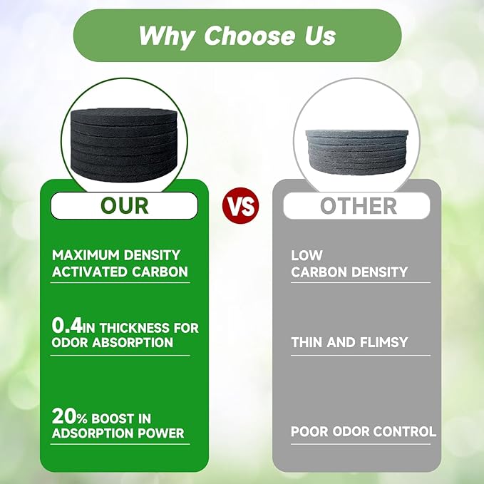 • 【Superior Thickness and Density】: Standing apart with a thickness of 0.4 inches, charcoal filters for compost bucket are twice as dense and twice as thick as standard options, offering enhanced odor absorption and long-lasting use