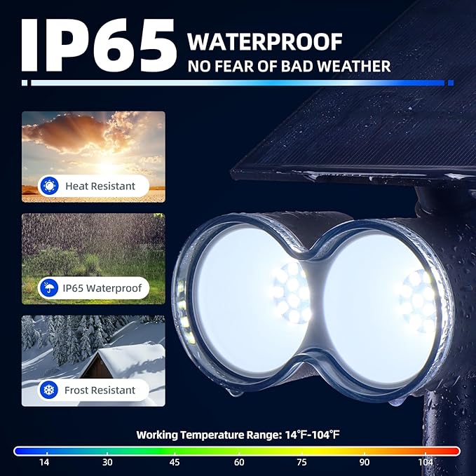 • IP65 Waterproof and Auto On/Off: No need to worry about bad weather. These solar lights outdoor waterproof can withstand snow and heat, operating from 14°F to 104°F. They automatically turn on at night and power off at dawn. Ideal for lighting yards, driveways, lawns, patios, pathways and more